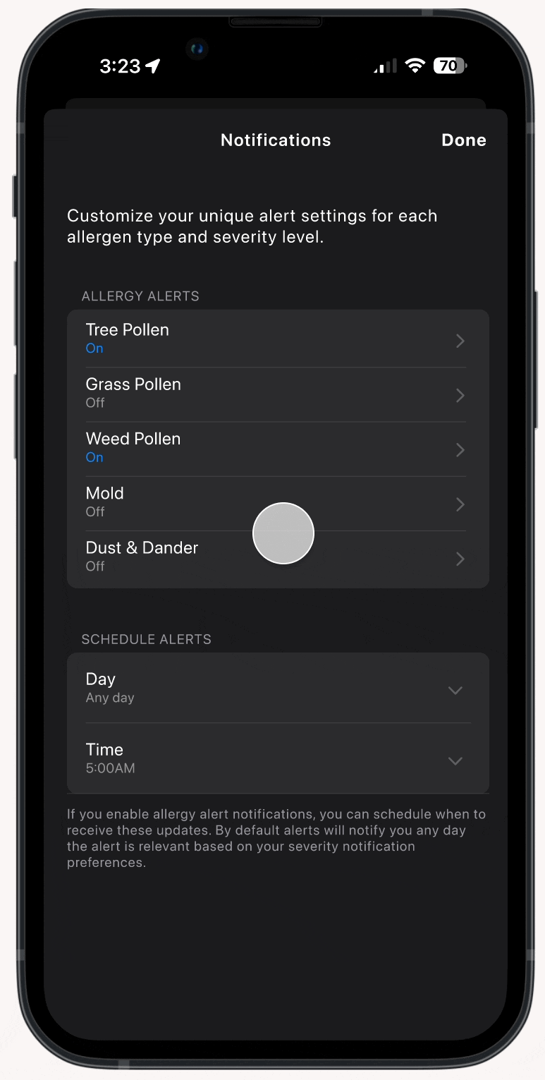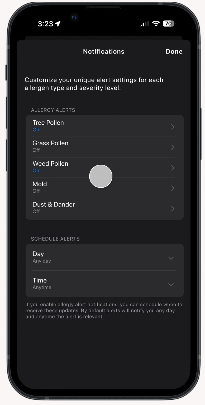 For allergen notifications, users navigate to the weather app notifications center where they see an additional section for the Allergy Alerts. Here they can set alerts for certain general allergen types or specific species and schedule them as well.