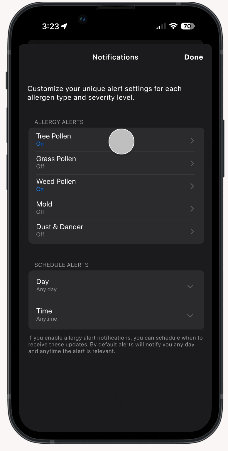 In this example, I click into the Tree Pollen section to set my custom alert. I select alerts for general tree pollen and specific tree pollen species.