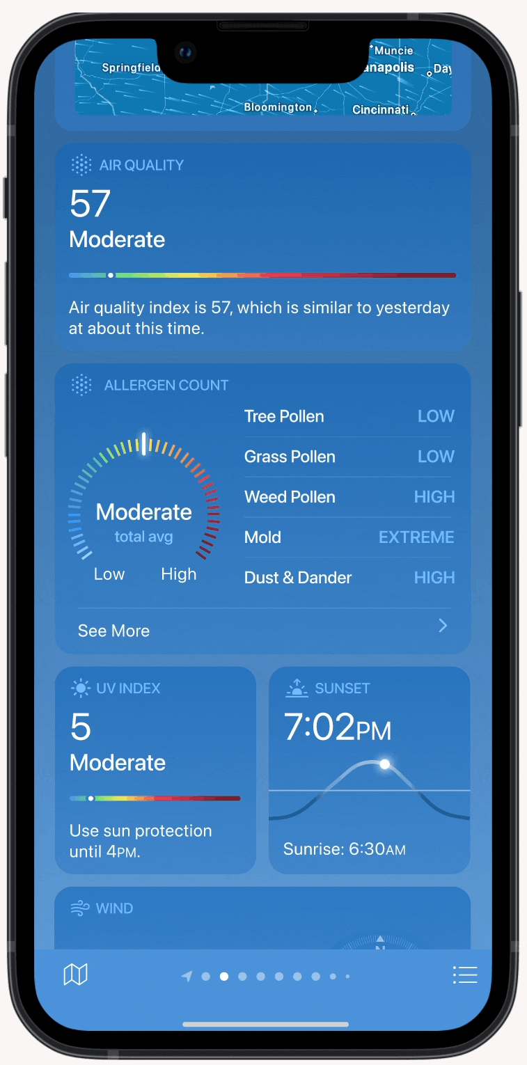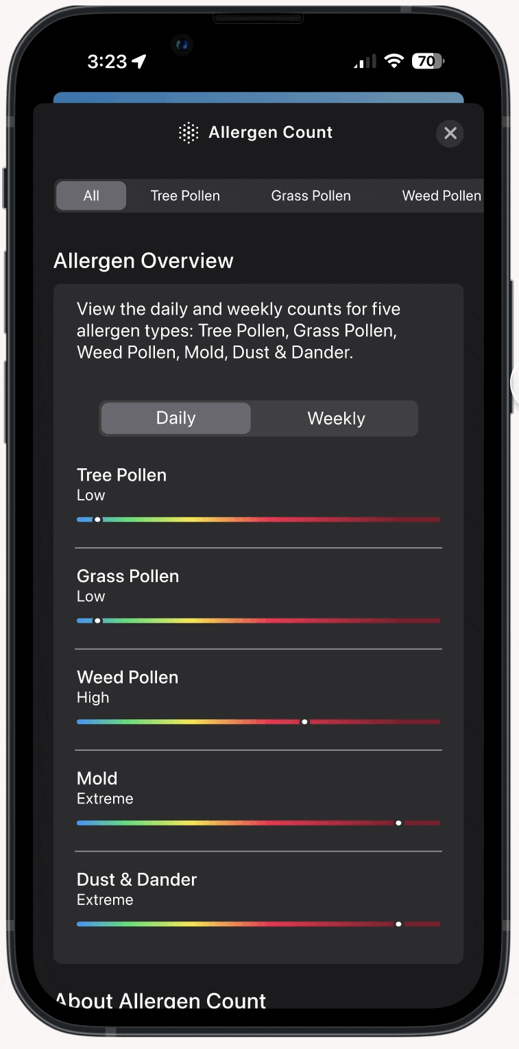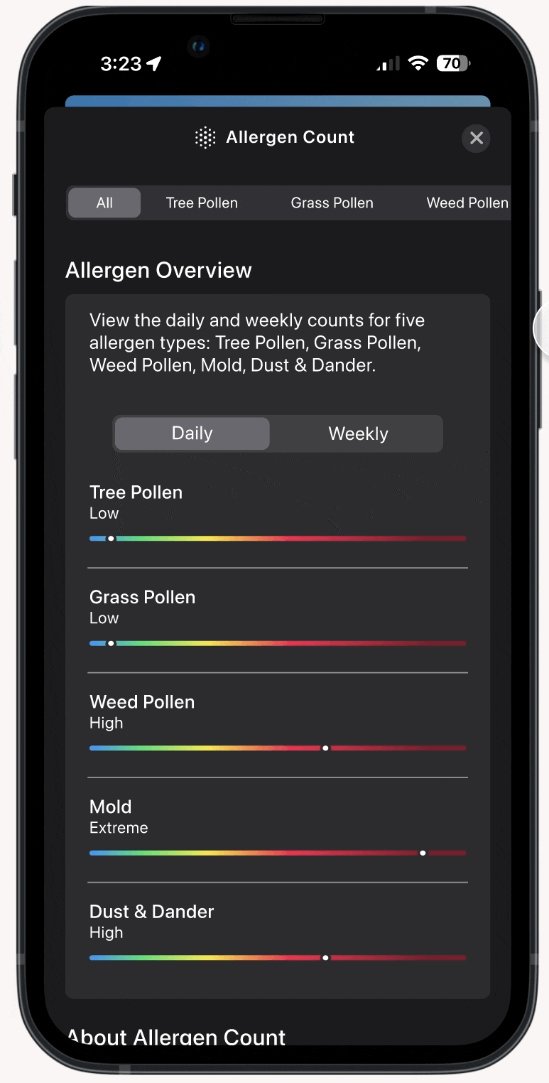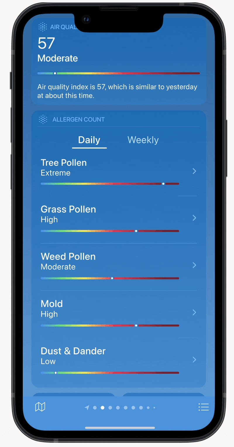 As the user scrolls through the weather app, they will come across the new allergen section. Here, users can see the 5 common outdoor allergen types and their severity levels for today or a weekly view.