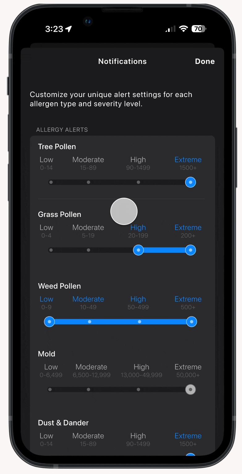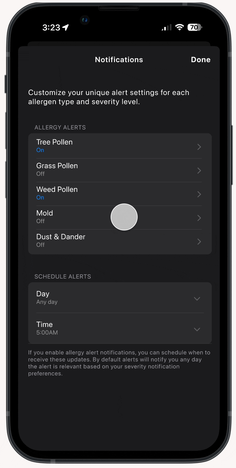 To set allergen alerts, users navigate to the weather app’s notification center. Here they will find an additional option for “Allergen Alerts”. There is a slider that allows users to set custom alerts for selected severity levels.