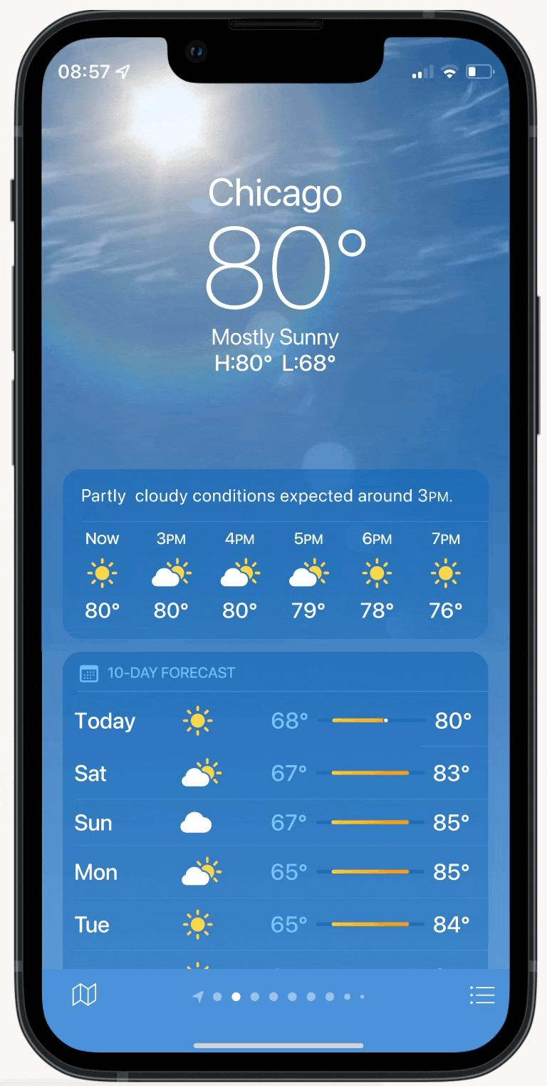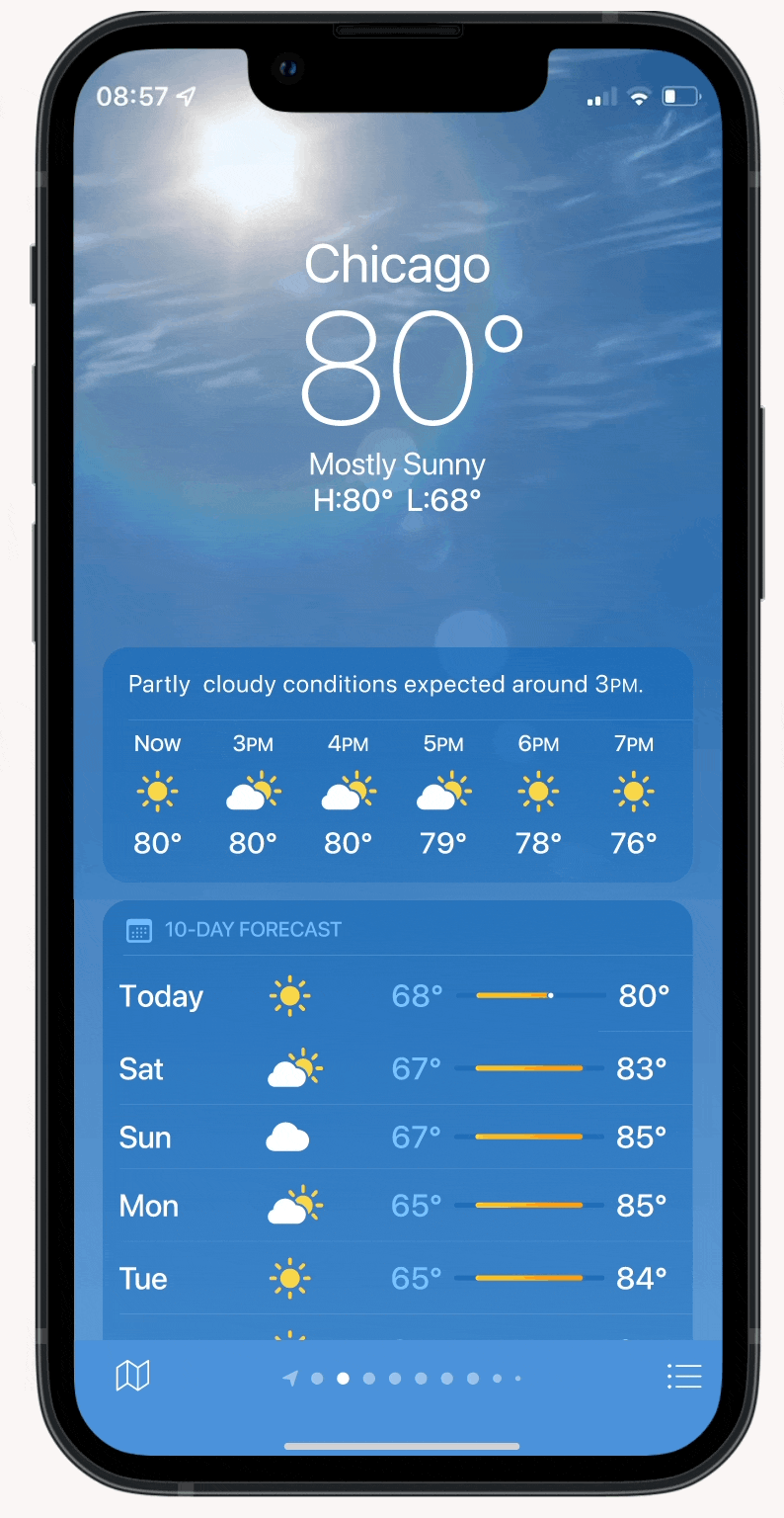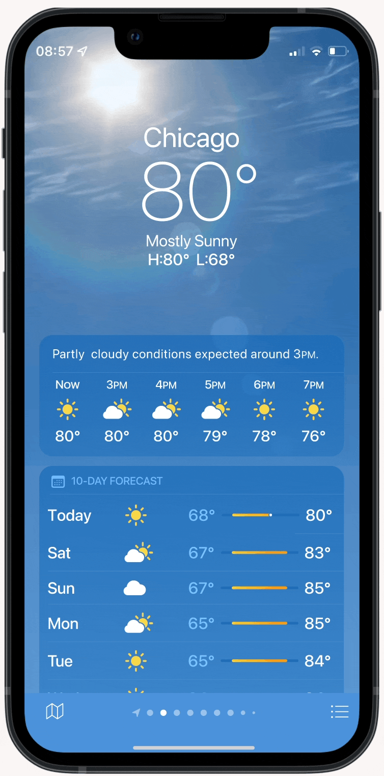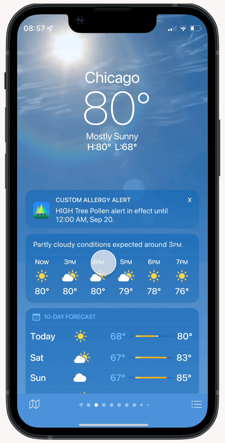 When users select this alert it will take them into the Apple Weather app where they will see their allergy alert at the top. This is similar to how severe weather alerts sit in the app.
