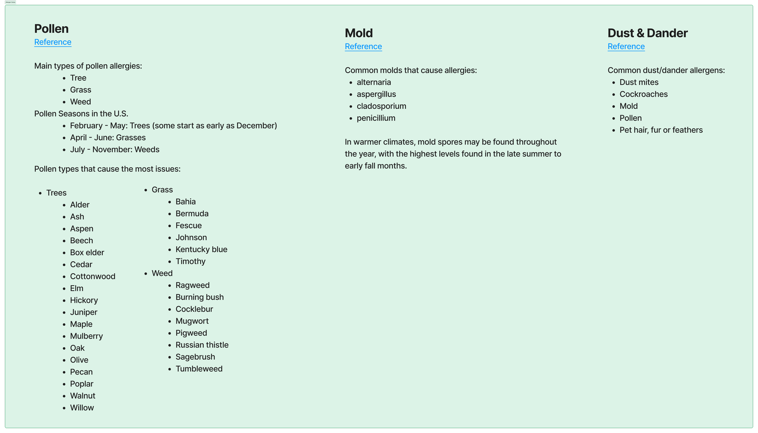 Users have the ability to click on a specific type of allergen to view more. In this example, I click on Tree pollen.