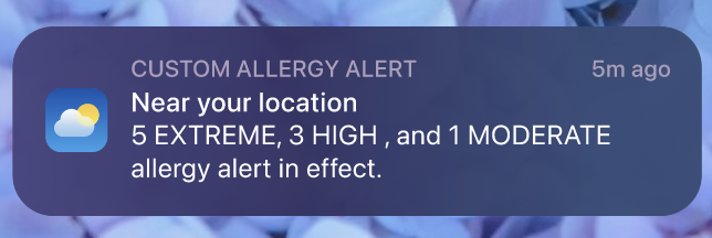 … see the same alert. Clicking the alert here (or on the Apple Weather app home screen) will take them to view the allergy alert details. Here they can view the detailed breakdown of their custom allergy alert.