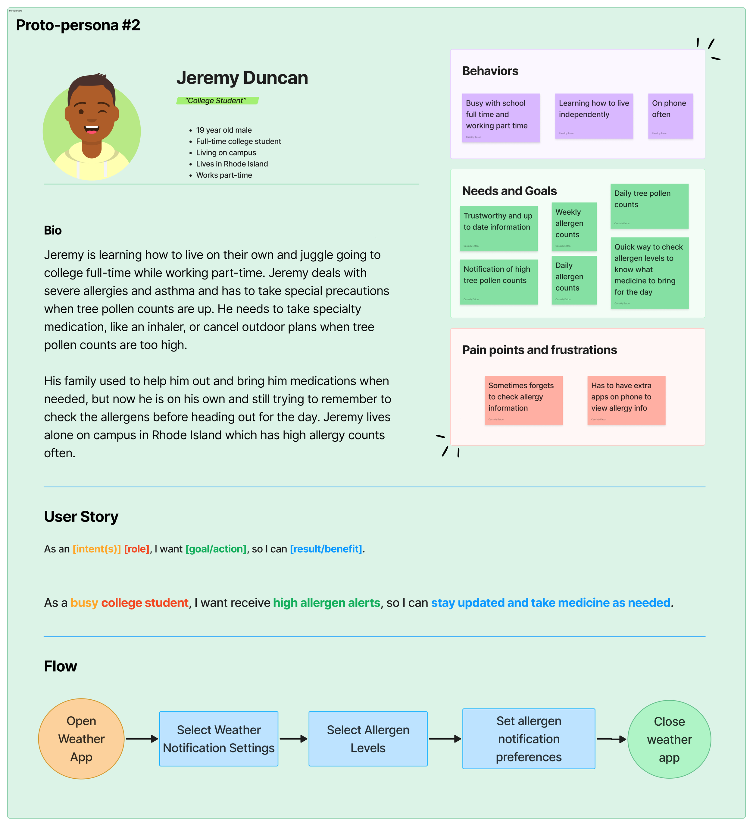 In this project, I wanted to elevate the experience of Apple’s weather app users dealing with allergies. Before diving into the app improvements, I focused on learning more about the weather app features and outdoor allergens. I then created two proto-personas, each with a unique story and user flow, to better understand the users I’m designing for and ensure user-centric decision-making. I outlined my goals for the features I wanted in the weather app. I knew I wanted to 1) Add allergy counts to the weather app home screen, 2) Display data for Pollen (Tree, Grass, Weed), Mold, and Dust & Dander, 3) Offer daily and weekly allergen views, 4) Show specific species data within each allergen type, 5) Let users set alerts for allergens when they reach a certain severity level, and 6) Add extra information about allergens
