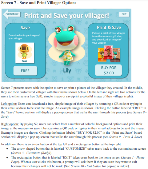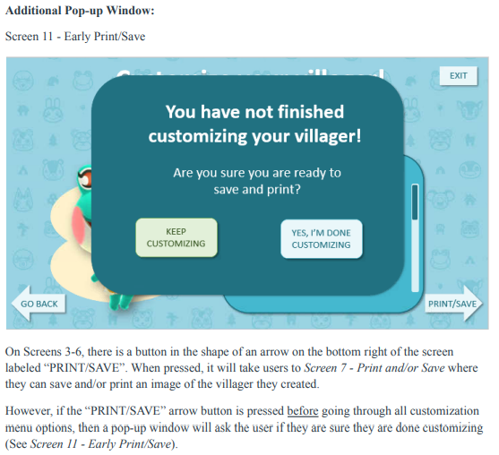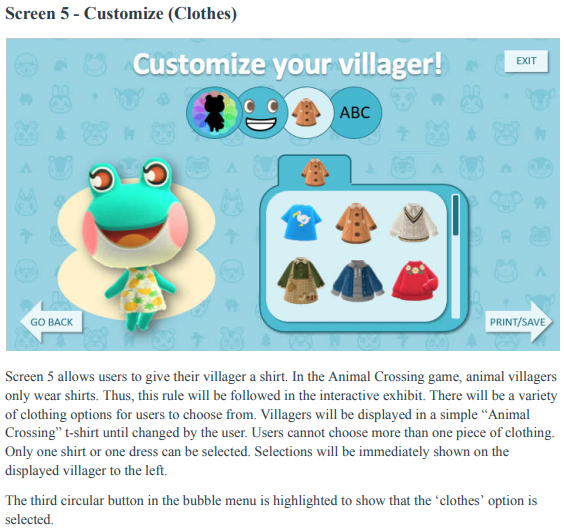 This interactive element of designing your unique villager will be quite simple and streamlined. Users will have options, but not too many as the entire process should only take a few minutes to complete. This is important because crowds should be minimized as much as possible and people of all ages will be using this. Thus it is important for the design to be simple and follow a step by step outline. The steps should be shown on the top of the screen and users can see what step they are on and what they have left. Users will be shown their villager as they are taken through the process. At the end, instructions should make it clear that the unique villager can be saved digitally for free or printed at the gift shop for $2. Nova, like other visitors, would print their villager to save the memory of the trip to the museum exhibit and as a homage to her favorite game. While at the gift shop to pick up a print of her villager, Nova would also pick up a plush or two of her favorite characters or villagers and maybe another item. Being able to remember this trip and have souvenirs for her favorite game are important.