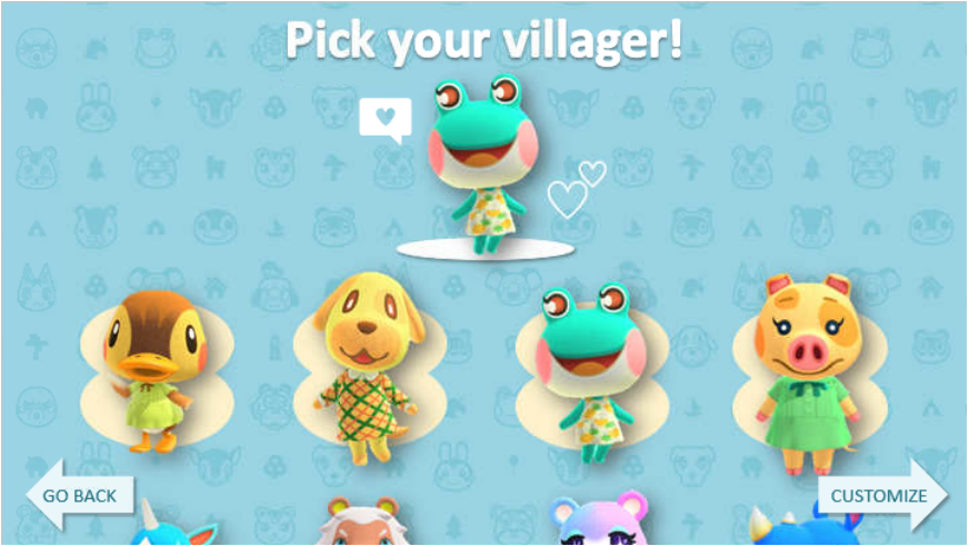User 3 - I can scroll through different animal villagers and pick one I want to customize.