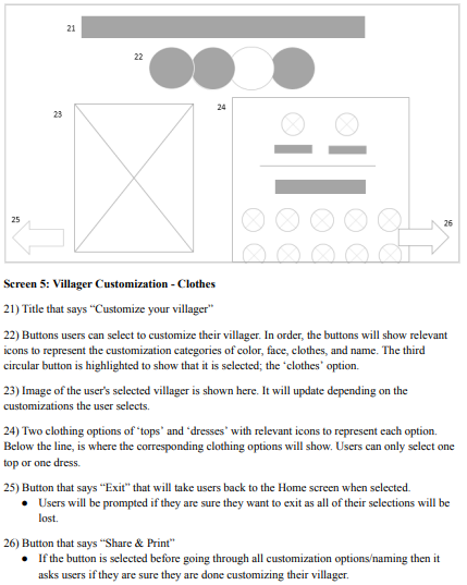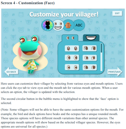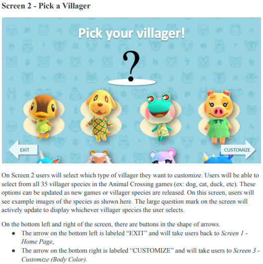 The villager customization screens (Screens 3-6) were also adjusted through my iterations. I decided to take the clothing options from offering two sections for shirts and dresses down to just one section (See Screen 5 - Customization (Clothes)). This is because I remembered that in Animal Crossing games the villager's shirts and dresses are the same length so I wanted to stay true to the game. This also helped cut down on another click users would have to make in this process despite no visual length difference between the two types of clothing. I also decided to adjust the way I was visually showing multiple options in a particular section. An example of this is within face customization where users can choose to customize their villager's eyes and mouth. Originally I had it all within one section but eventually redesigned this to instead mimic a tabbed folder to view all eye or all mouth options.