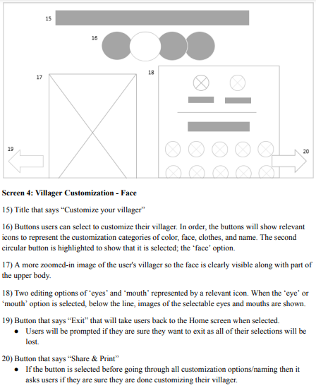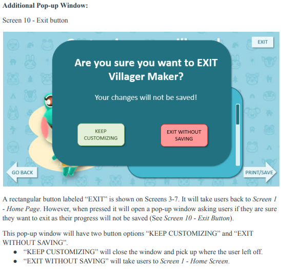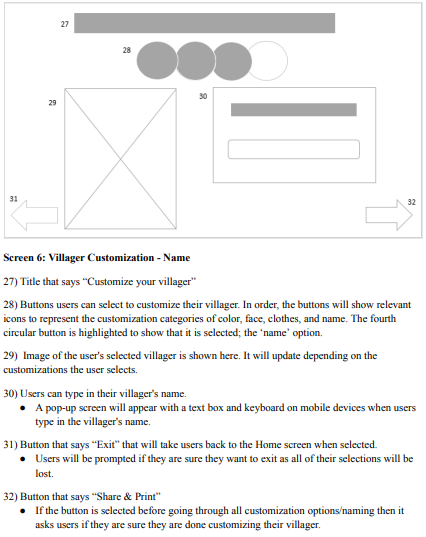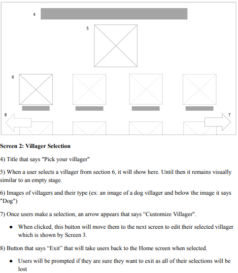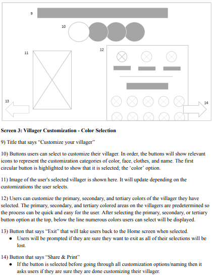 After testing, I made more improvements to the customization process. Specifically, the body color customization section (See Screen 3 - Customization (Body)) was adjusted because it became clear that it was confusing for users, especially those with little experience customizing characters in video games. To resolve confusion, I added some clearer visual cues, labeled the color sections (as primary, secondary, and accent), and added instructions when first viewing this screen. Now, the final UI shows preselected colors that the villager is shown with by default with brief, clear instructions to help new users understand how to use this feature. I also added an exit button in the customization section (Screens 3-6) as I noticed it was missing during testing. I wanted to make sure users can easily and quickly exit to the home screen during any stage of the villager-maker process.
