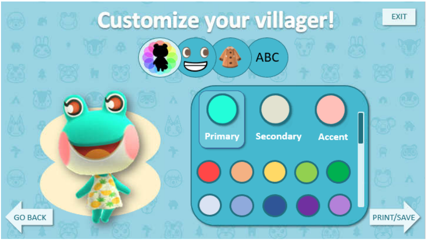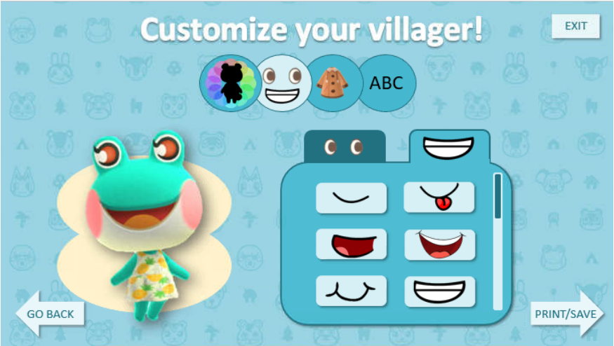 User 2 - I think the first button with the black animal means you can pick different color frogs you want. So I’d probably pick purple to see what it looks like. The second is the smile so I think you can pick different smiles. The coat seems like you can pick different clothes. ABC is where I think you can name the villager. If I didn’t like the colors I’d go back and pick a different villager. If I liked it I’d go to print and save.
