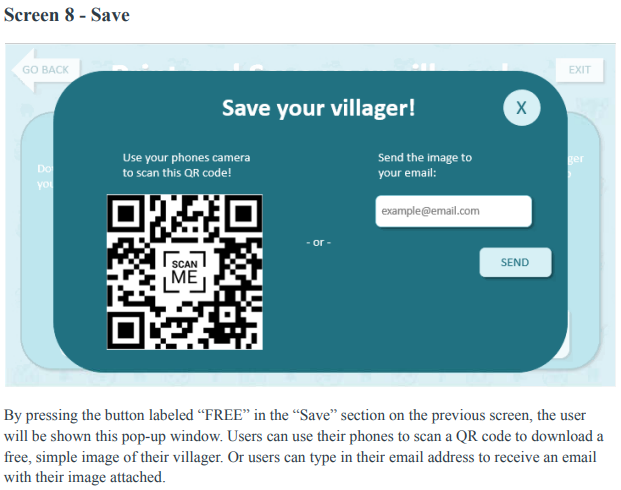 User 3 - It looks like you can save or save and print your villager you made. Save is free and gives you a simple picture to download. I assume its either a QR code or like you put in your email or phone number. Then Save and print is $2.99 and it looks like you have a cooler image and more customization options.