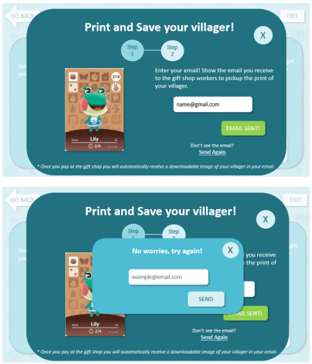 User 3 - I see my villager on the background I customized. I also see the instructions to put in my email and then show the email I receive to the gift shop to get my picture. Also that I will get an email with my image once I pay for it at the gift shop.