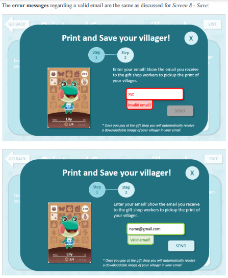 Lastly, I ensured there were appropriate error messages with prompts to help the user fix/understand errors. This was especially useful in the “Save” and “Print & Save” sections as they require users to type in their email address to receive an email with a downloadable image of their villager. If a user types in an invalid email address, the text box is highlighted red and a tab pops ups that says “Invalid email!”. The “SEND” button is then also grayed out so it cannot be pressed. Once the user fixes the email and it is valid, it will change from red to green and the tab will update to say “valid email!”. The user can then press the “SEND” button as it is no longer grayed out. When the user inputs a valid email and hits “SEND” then the button will turn green and say “SENT!”. There is also a way for users to resend the email if they do not see it or do not receive the email.