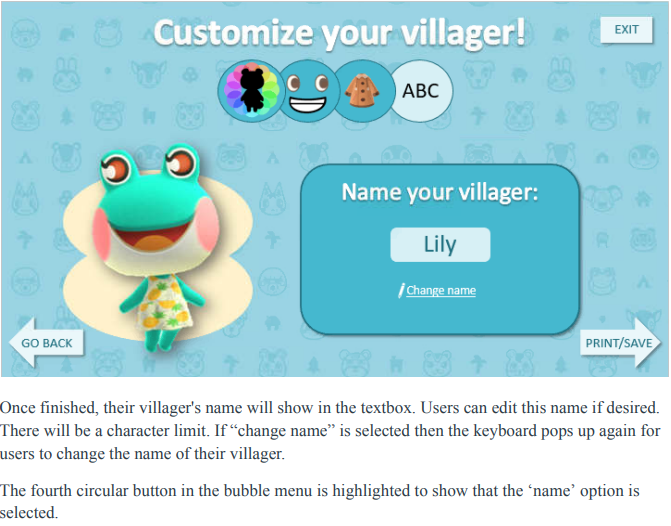 The primary interactive element of this exhibit will be a kiosk and sitting area where users can create their own villager. Nova is extremely excited to do this as the villagers are one of her favotire parts about Animal Crossing: New Horizons. In order to avoid crowding and lines as much as possible, users can quickly scan a QR code and build their villager on their smart phone instead (or any device that has internet access). It is important to Nova that there is not much crowding and plenty of areas to sit. At this kiosk, or within the sitting area using her mobile device, Nova will be walked through a brief process of making her own villager. Nova will first be able to choose what animal their villager will be from a selection menu. Next, Nova can select facial features like eyes, freckles, nose, and mouth options. Then, she can select a unique color scheme for their villager and any clothes they want to add. Lastly, Nova can pick a background for their villager to be on and type in the villagers name. Nova and other users of this interactive part of the exhibit have the option to print an image of their unique villager and download a digital copy. If users want a special printed image of their villager, they can send it to the gift shop to pick up at the front desk and pay a $2 fee. Otherwise they can download a free copy to their device.